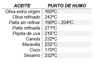 A continuación, mostramos una breve tabla con los distintos puntos de humo de los aceites más comunes: