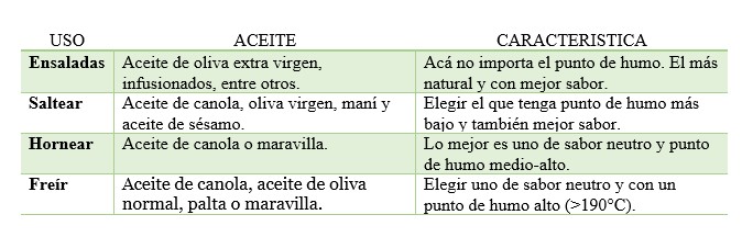 Es un aspecto fundamental a considerar, hay algunos aceites que son mejores para preparaciones frías y otros para tratar a temperaturas altas. Cuando calentamos un aceite por sobre su punto de humo, empiezan a perder sus grasas “buenas”, se daña y libera sustancias potencialmente dañinas. Mientras más procesado es un aceite tiene un mayor punto de humo y lo podemos usar para saltear o freír, mientras que los menos procesados o “vírgenes” tienen un punto de humo más bajo, haciéndolo perfecto para ensaladas.