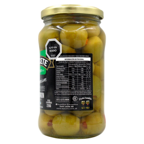 Aceituna Verde con Pimentón Premium Frasco 220 grs escurrido Marca Nucete