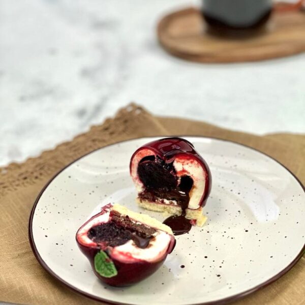 Con un centro de guinda ácida, salsa de chocolate, bizcocho de cacao y crema de vainilla, este postre está endulzado con alulosa, lo que lo convierte en una opción ideal para quienes buscan alternativas más saludables. Su elaboración es 100% artesanal, sin conservantes ni preservantes.