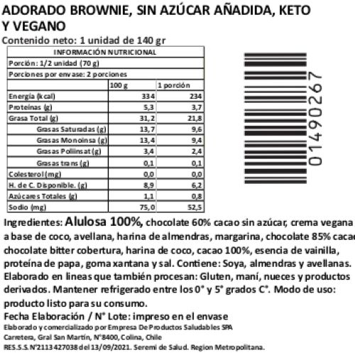 Adorado Brownie, Sin Azúcar Añadida, Keto y Vegano, 140 g, Tremus