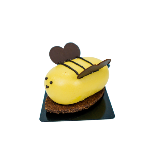 En su capa superior, una mousse ligera de miel aporta textura sedosa y un aroma floral característico. Todo se envuelve en una cobertura de chocolate blanco con efecto terciopelo.