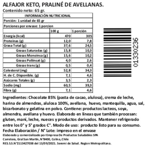 Elaborado artesanalmente con ingredientes nobles y sin azúcar añadida, este alfajor ofrece 7,8 g de proteína y solo 4,6 g de carbohidratos por porción de 65 g, siendo además una buena fuente de fibra.