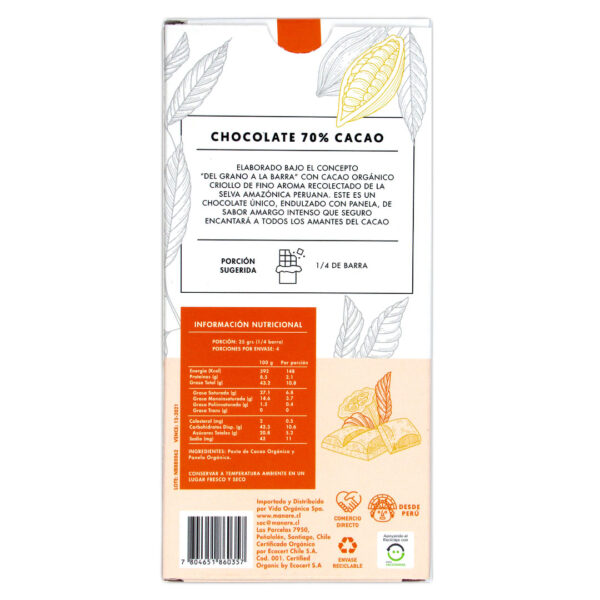 Elaborado bajo el concepto «del grano a la barra» con cacao orgánico criollo de fino aroma recolectado de la selva amazónica peruana. Este es un chocolate de sabor intenso que seguro encantará a todos los amantes del cacao.