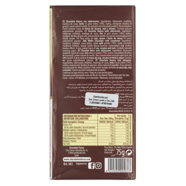 Barra de Chocolate Blanco Sin Azucar Añadida Sin Guten 75 grs Marca Torras