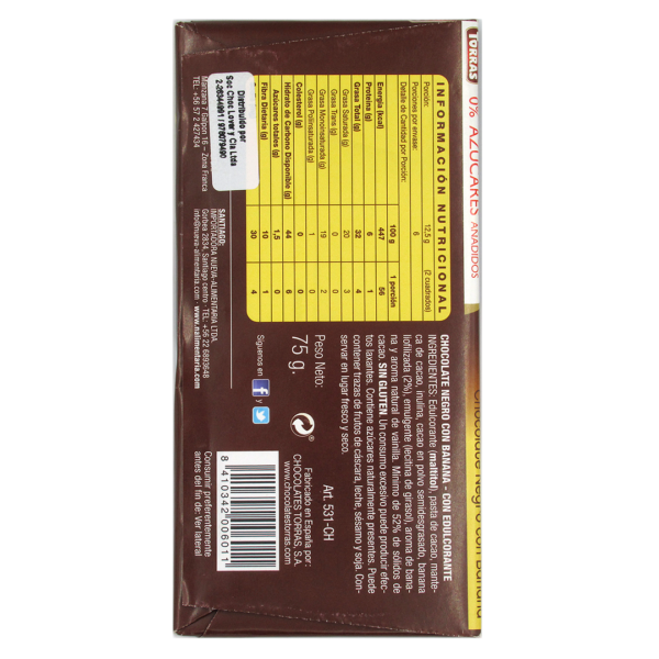 Barra de Chocolate Negro 50% Cacao con Banana, sin azucar añadida y sin gluten, 75 grs, Marca Torras