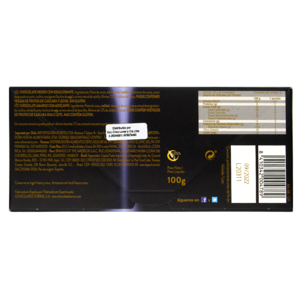 Barra de Chocolate Zero 72% Cacao sin azucar añadida y sin gluten 100 grs Marca Torras