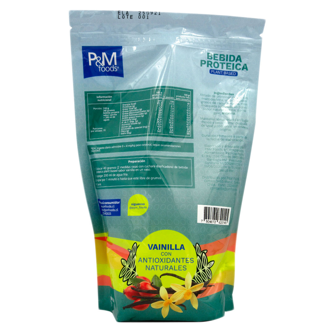 Bebida Proteica Plant Based sabor vainilla apto para veganos 600 grs marca P&M Foods