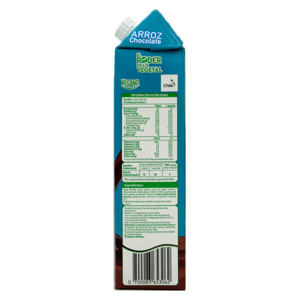616778012180-dca65b95-8ee9″INGREDIENTES: Agua filtrada, arroz, azúcar, cacao en polvo, mono y diglicéridos de ácidos grasos, fosfato tricálcico, goma guar, goma xantán, sal de mar, Vitamina E, estevia (glicósidos de esteviol), gluconato de zinc Vitamina A, Vitamina D, Vitamina B12.