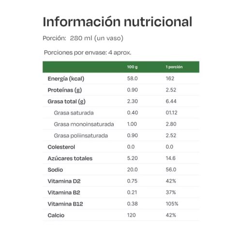 Ingredientes: Agua, Avena italiana, Aceite de girasol, Carbonato de calcio, Vitamina b2, Vitamina b12, Vitamina d2, Gluten