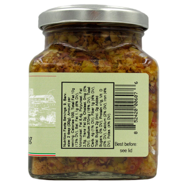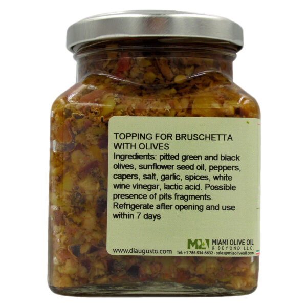 Nuestra Bruschetta Olive Topping es el complemento ideal para galletas saladas y rebanadas de pan francés tostado.