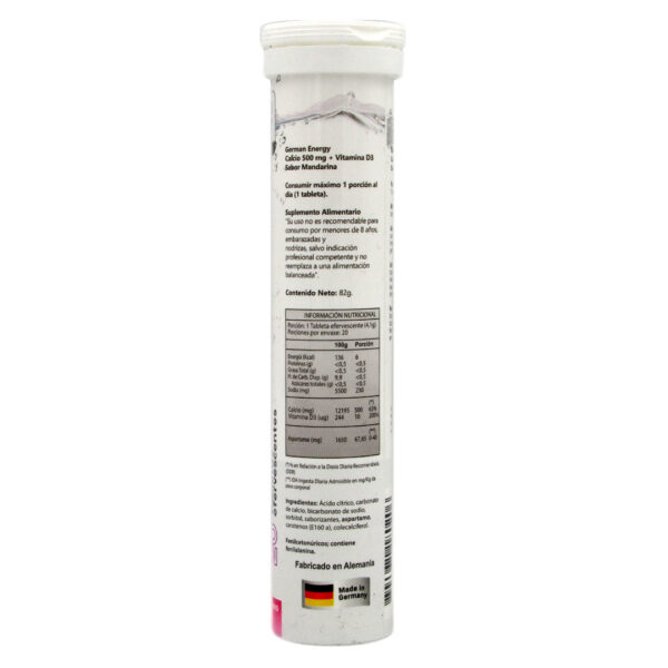 Calcio + Vitamina D3 Sabor Mandarina Sin Gluten 20 Tabletas Efervescentes Marca German Energy
