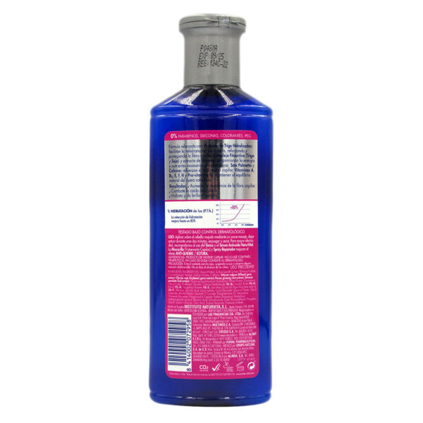 Champú de uso frecuente que previene la rotura de la fibra capilar, nutre y refuerza los cabellos largos. Contiene un porcentaje elevado de extractos vegetales, como las Proteínas de Trigo hidrolizadas (P.T.h.) que facilitan la rehidratación del cabello, reforzando y protegiendo así la fibra capilar frente a la rotura. El Complejo Fitoactivo, obtenido a partir de semillas de Trigo y Soja en germinación, junto al extracto de Ginseng, proporcionan energía al bulbo piloso, además de los nutrientes necesarios para favorecer el crecimiento capilar. El Saw Palmetto y la Cafeína refuerzan el crecimiento capilar. Las vitaminas A, B 5, E, F, H y Pro-vitamina B5 mantienen el equilibrio natural del cuero cabelludo.