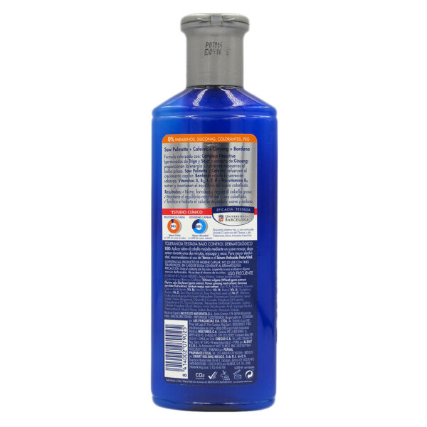 Champú de uso frecuente que nutre el cuero cabelludo y regula la secreción sebácea. Contiene un elevado porcentaje de ingredientes naturales, como los extractos de Saw Palmetto, Bardana, Ginseng y Complejo Fitoactivo (obtenido de semillas de Trigo y Soja). Estos proporcionan al bulbo piloso energía y nutrientes para fortalecer el crecimiento del cabello. La Cafeína permite activar la microcirculación del cuero cabelludo, ayudando a que los principios activos se absorban con más facilidad y así reforzar el crecimiento capilar.
