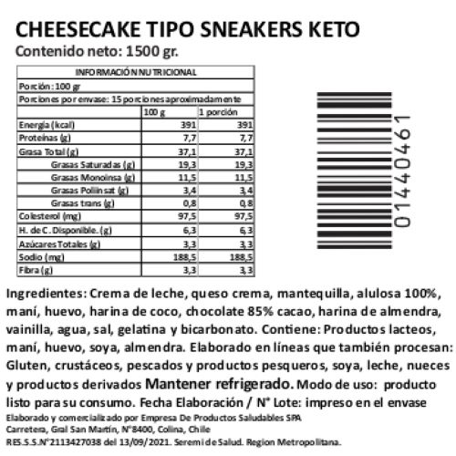 Cheesecake estilo Snickers keto sin azúcar añadida, con base de almendra, manjar keto, mantequilla de maní y chocolate 85 % caco. Buena fuente de proteína y fibra. Solo 6,3 g de hidratos de carbono por porción. Unidad de 1500 g.