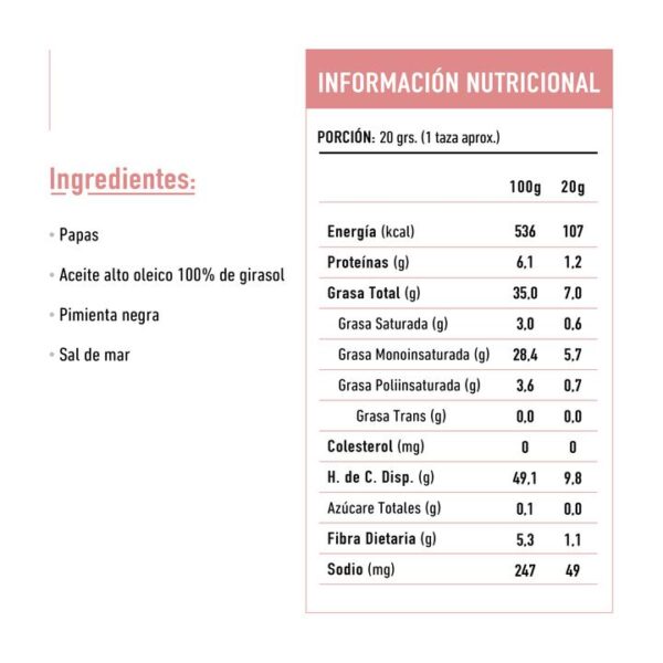 Al igual que en todos nuestros productos, aquí también usamos ingredientes 100% naturales; papas nativas frescas, aceite alto oleico 100% de girasol, pimienta negra fresca y sal de mar.