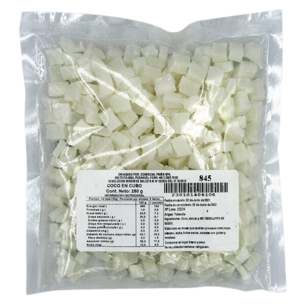 250 grCOCO EN CUBOS CON AZÚCAR, IDEALES PARA COMERLOS COMO SNACK, DARLE DULZOR A TUS GRANOLAS O PARA COMERLO AL DESAYUNO MEZCLADO CON YOGURT, LECHE Y/O FRUTAS.