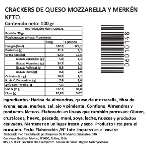 (D) Crackers Queso Mozzarella Merkén, Keto, 100 gr, Marca Tremus