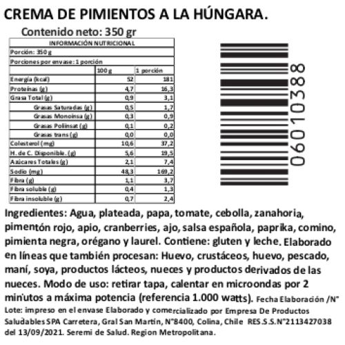 Crema artesanal de pimientos rojos al estilo húngaro con plateada de res y vegetales frescos. Buena fuente de fibra, con 16,3 g de proteína por porción. Natural, nutritiva y llena de sabor Tremus. Unidad de 350 g.