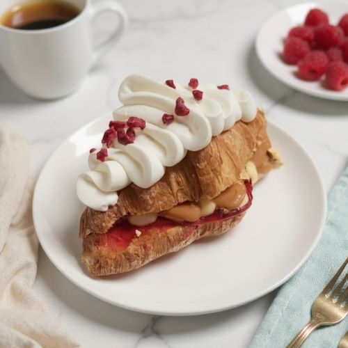 Croissant con relleno compuesto por manjar, crema pastelera, delicada crema chantilly, galletas de hojarasca y mermelada natural de frambuesa Tremus.