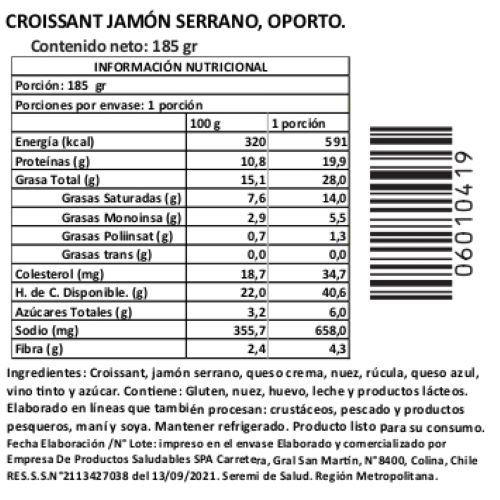 Croissant artesanal relleno con jamón serrano, queso azul y nueces. 19,9 g de proteína por porción, buena fuente de fibra y sabor intenso. Elaborado con ingredientes nobles y sin azúcar añadida. Unidad de 185 g.