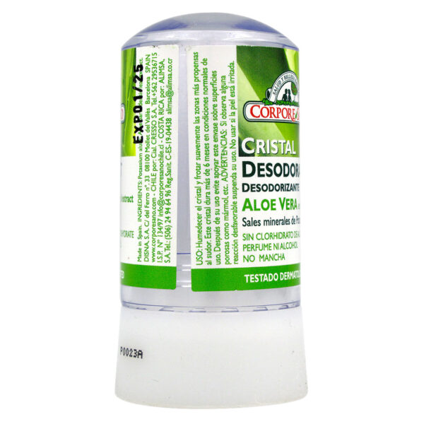 El Desodorante Mineral de Potassium Alum con Aloe Vera de Corpore Sano, es natural, de larga duración (puede durar hasta un año) y no mancha. Desde hace siglos se han aprovechado las propiedades cicatrizantes y bactericidas del Sulfato de Aluminio y Potasio cristalizado, que además combate eficazmente el mal olor en axilas y pies.