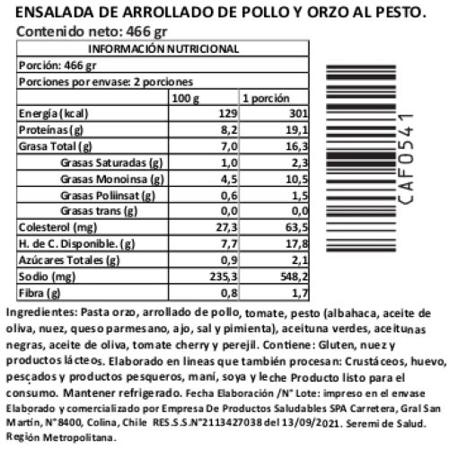Su base de orzo tricolor se mezcla con arrollado de pollo artesanal, tomates frescos, aceitunas verdes y negras, todo integrado con un pesto casero elaborado con aceite de oliva y perejil fresco.