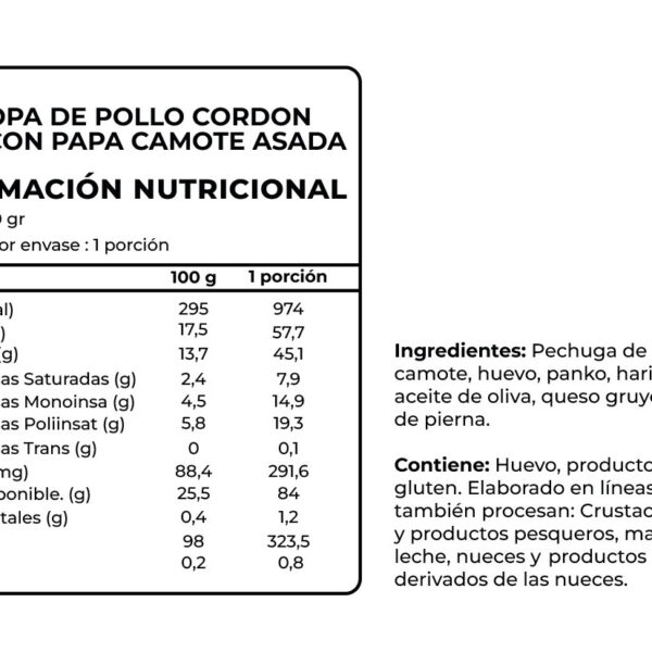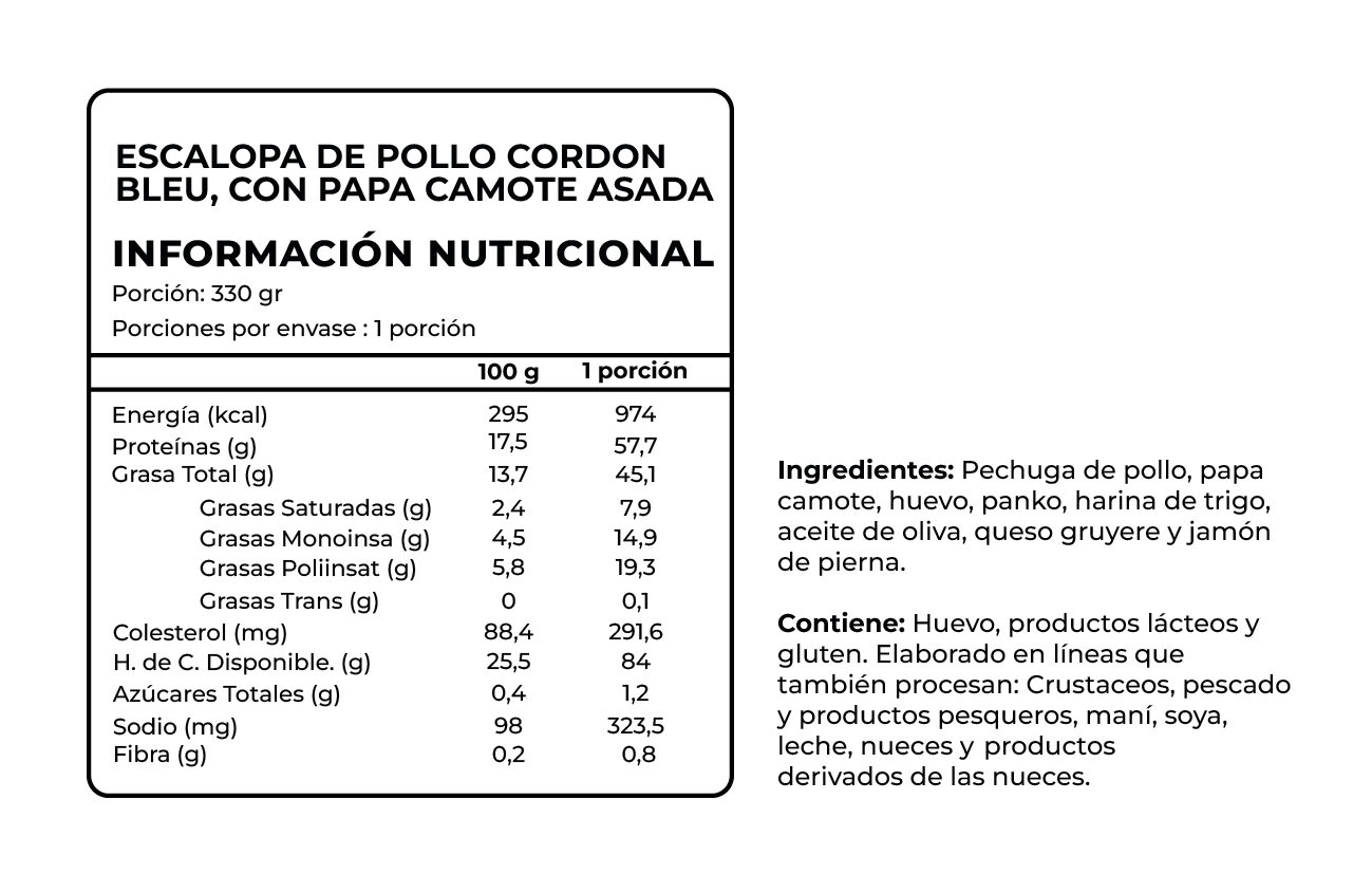 La Escalopa de Pollo Cordon Bleu con Papa Camote Asada Tremus es una preparación gourmet y artesanal, que combina lo mejor de la cocina tradicional con una propuesta saludable y equilibrada.