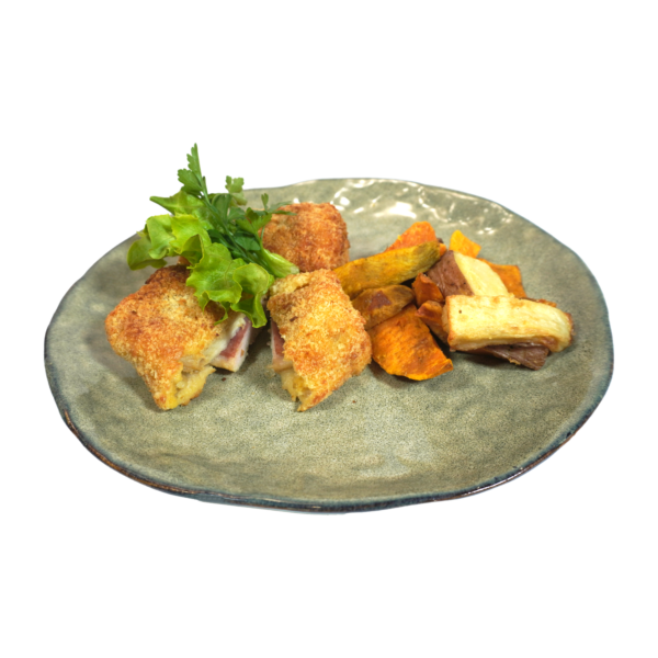 La pechuga de pollo se rellena con queso gruyere y jamón de pierna, se empaniza con panko crujiente y se cocina a la perfección para lograr una textura dorada por fuera y jugosa por dentro.
