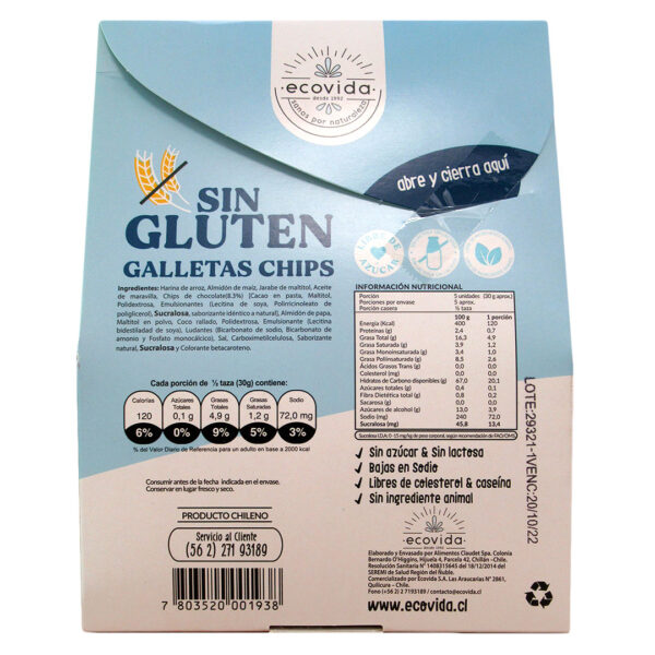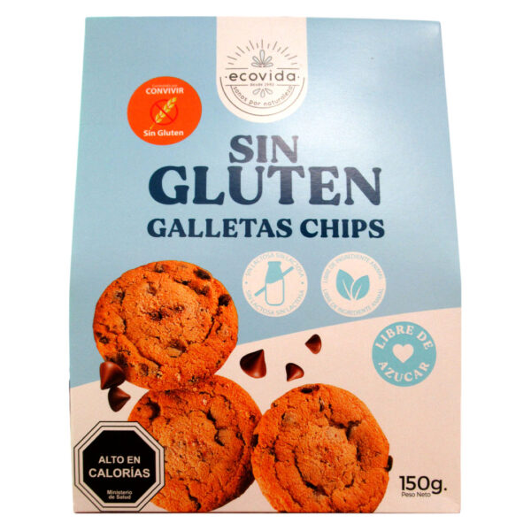 Galletas Con Chips de Chocolate Sin Gluten Sin Azúcar Sin Lactosa Vegana 150 grs Marca EcoVida