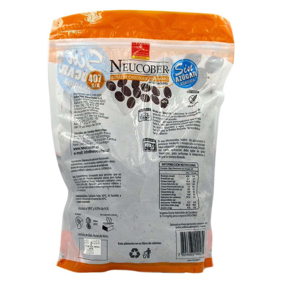Gotas de Chocolate Sucedaneo para baño y moldeo Sin Azucar añadida Sin Gluten 1 kg Marca Neucober