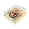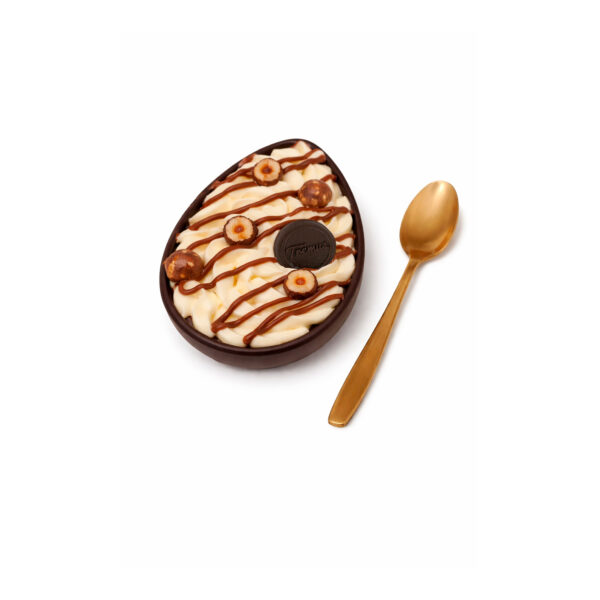 Casquillo de chocolate bitter, relleno con ganache de praliné de avellanas y ganache montado de chocolate blanco, coronado con un suave ganache batido de chocolate de leche.