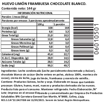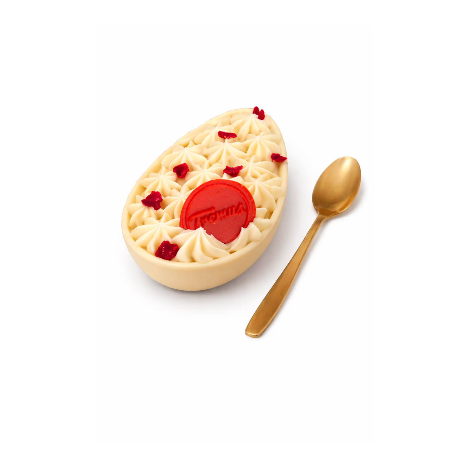 Casquillo de chocolate blanco, relleno tipo pie de limón con frambuesa y coronado con ganache montado de chocolate blanco.