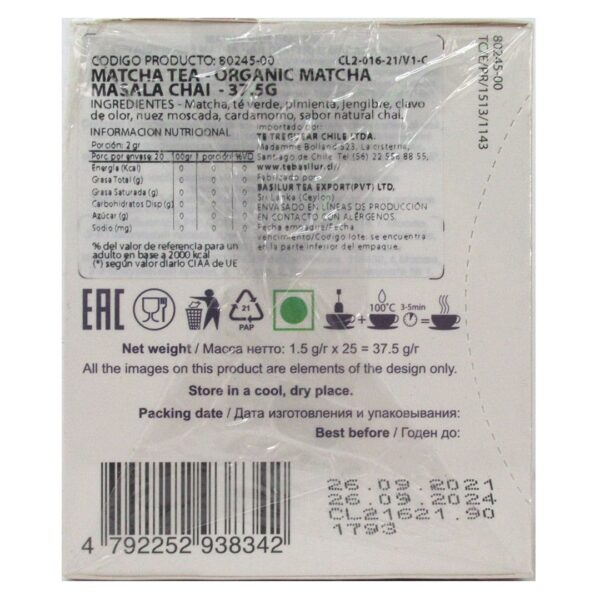 Infusión Orgánica de Matcha Masala Chai 25 bolsas Marca Tipson