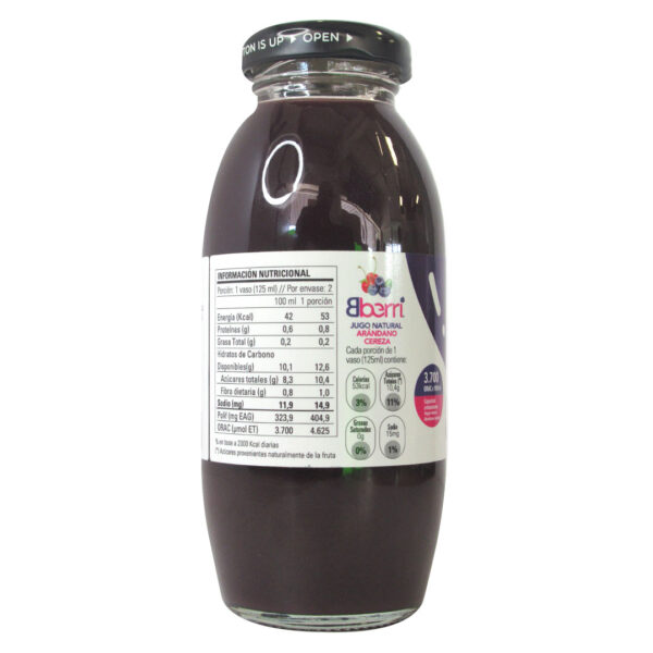 Las frutas. Además de tener cientos de nuestros mejores arándanos, este jugo lleva también cerezas chilenas, ambos frutos cosechados a mano.
