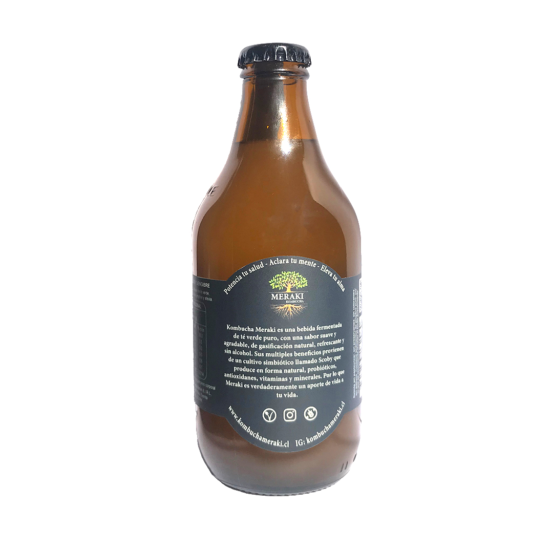 Kombucha Meraki es una bebida hecha 100% de té verde y zumo exprimido de jengibre, sin alcohol, burbujeante, rica y refrescante. Posee probióticos, antioxidantes, polifenoles, aminoácidos, vitaminas y minerales que revitalizan tu cuerpo, aclaran tu mente y elevan tu alma.