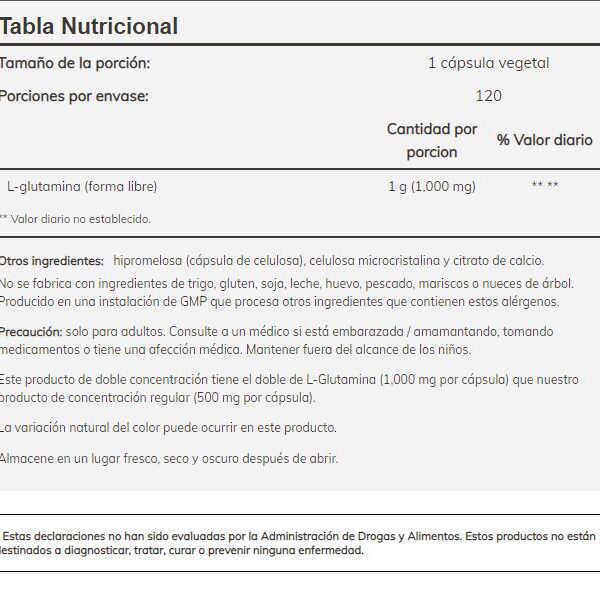 Este producto de doble concentración tiene el doble de L-Glutamina (1,000 mg por cápsula) que nuestro producto de concentración regular (500 mg por cápsula).