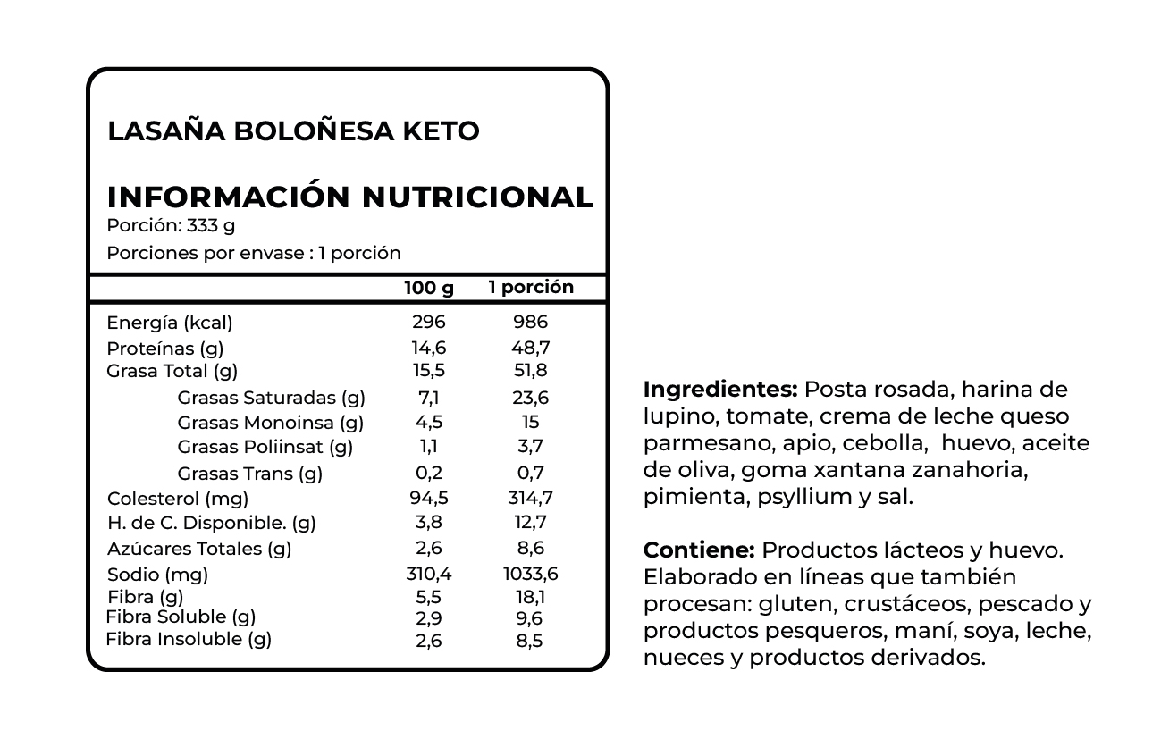 Lasaña keto artesanal con salsa boloñesa y bechamel keto, gratinada con parmesano. Porción individual de 333 g con 48,7 g de proteína y excelente fuente de fibra. Natural, equilibrada y llena de sabor casero.