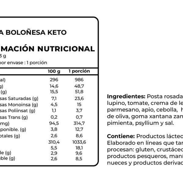 - Masa de lasaña keto (artesanal): A base de harina de lupino, psyllium y huevo. Ingredientes que hacen que esta masa tenga una excelente aporte de fibra y proteína, siendo keto a la vez.