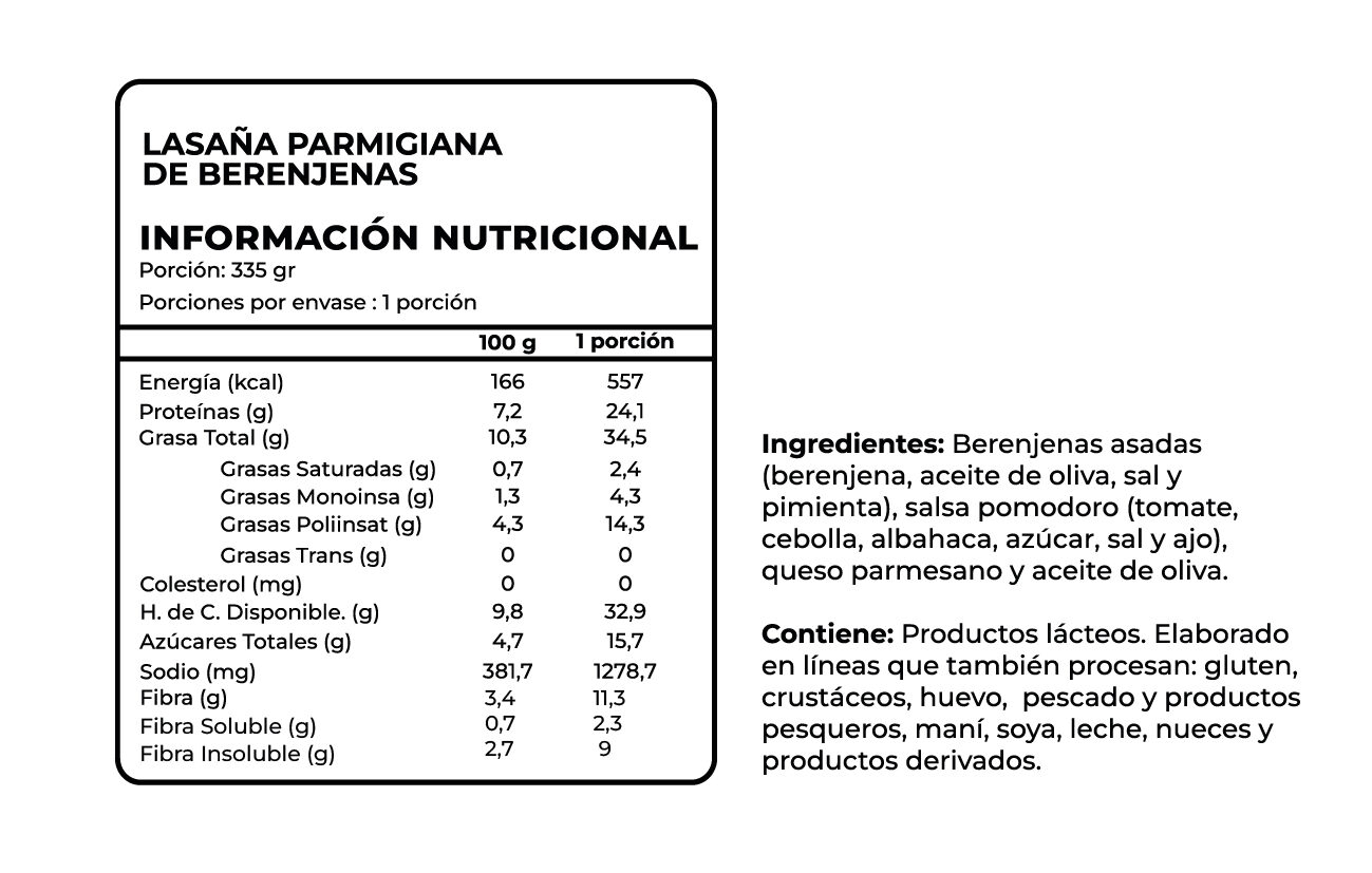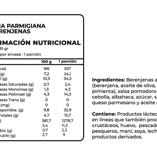 Es una preparación vegetariana, completa y reconfortante, con 24,1 g de proteína por porción y excelente fuente de fibra gracias al protagonismo de la berenjena y las verduras del sofrito.