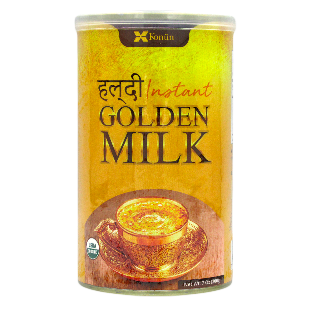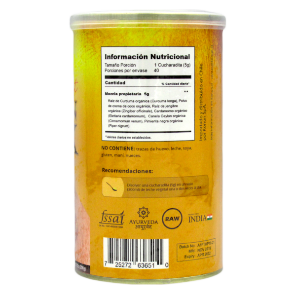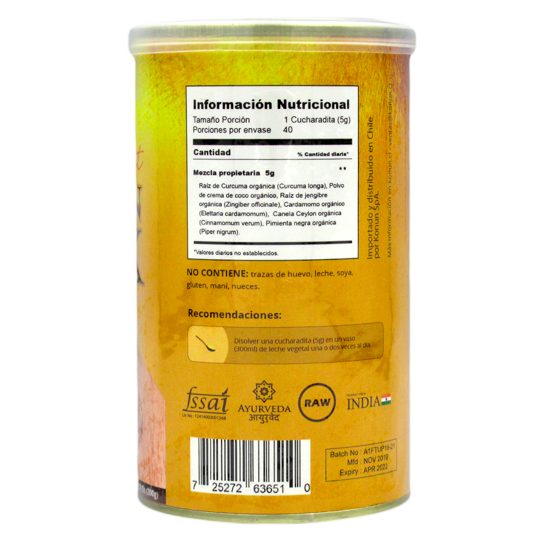 “Leche dorada” instantánea en polvo, Contiene: Cúrcuma, pimienta negra, Crema de coco, Cardamomo, Canela ceylon y Raíz de Jengibre. Contenido neto: 200 g. Origen: Sur de la India. Producto libre de gluten, vegano. Sellos: USDA ORGANIC, ORGANIC INDIA, GMP QUALITY.