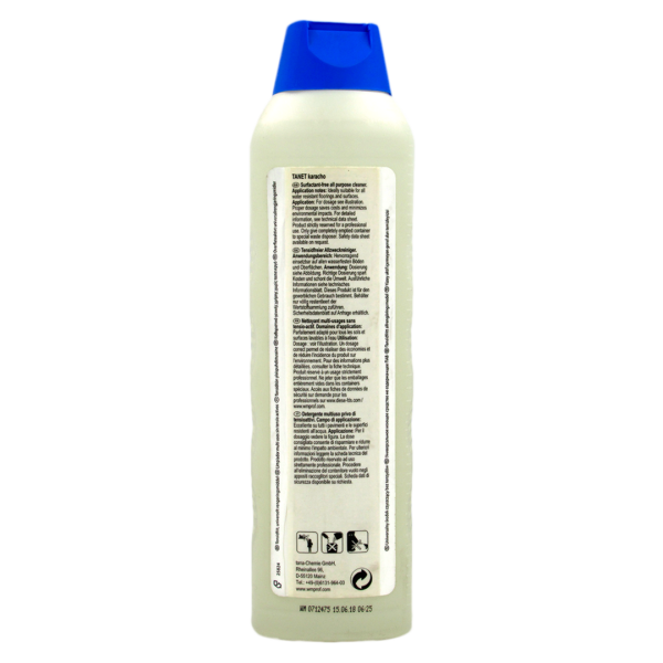 TANET karacho es un limpiador multiusos sin tensioactivos con excelentes propiedades medioambientales. Presenta una elevada efi cacia limpiadora y una excelente compatibilidad de material.