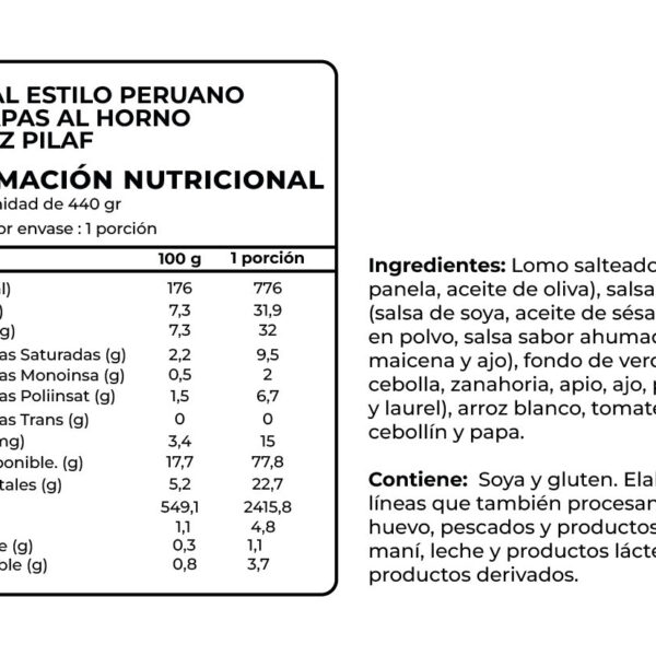 Cada porción (440 g) aporta 31,9 g de proteína y es buena fuente de fibra gracias a los vegetales y a la papa horneada.