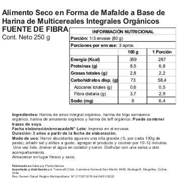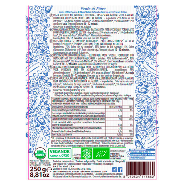 Su cualidad Multicereal se debe a que es elaborada con harinas de Arroz Integral, de Trigo Sarraceno, Amaranto y Teff, todas orgánicas.