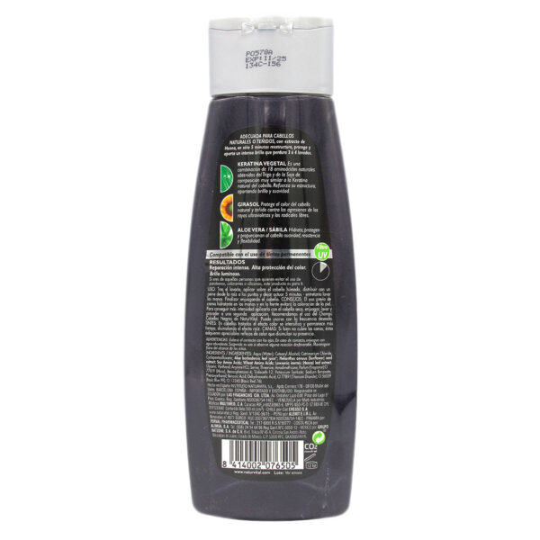 En el cabello negro, aporta intensos reflejos de color, protege el color natural del cabello, prolonga la persistencia del tinte permanente y disimula las canas. Incorpora filtro UV que protege el cabello negro de la radiación solar, asegurando así que el mantenimiento óptimo del color del cabello.