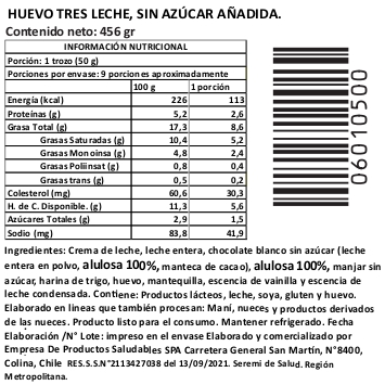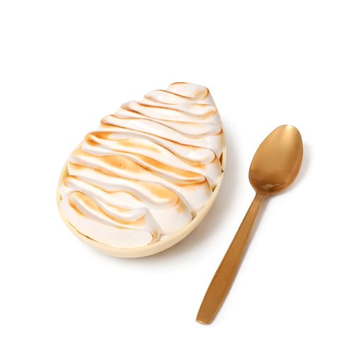 Casquillo de chocolate blanco, relleno tradicional tres leches con manjar sin azúcar añadida y coronado con un suave merengue.