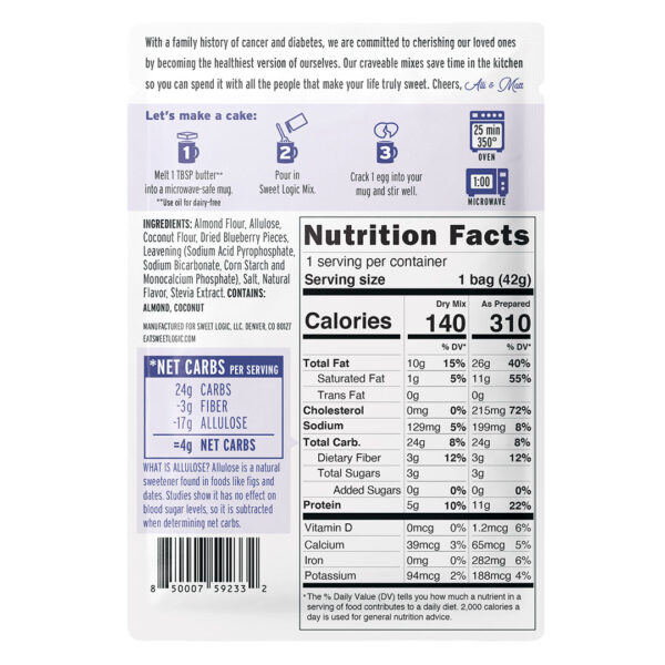 Mezcla para preparar Bizcocho en Taza, Sabor Arándanos, Keto, Libre de Gluten, 1 porción, Marca Sweet Logic