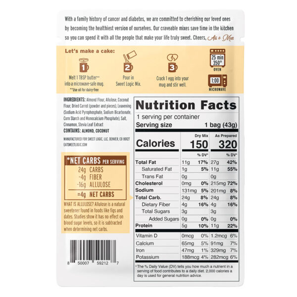 Mezcla para preparar Bizcocho en Taza, Sabor Zanahoria, Keto, Libre de Gluten, 1 porción, Marca Sweet Logic