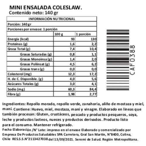 La Mini Ensalada Coleslaw Tremus combina repollo morado, repollo blanco y zanahoria rallada con un dressing de mostaza Dijon, mayonesa y vinagre de manzana, endulzado suavemente con miel de abejas y realzado con limón, sal y pimienta blanca.