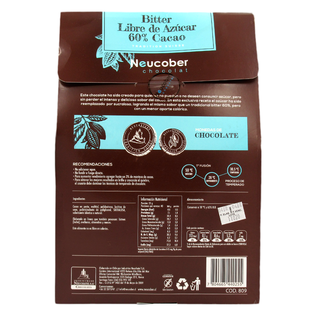 Monedas de Chocolate 60% Cacao sin azucar sin gluten 1 kg marca Neucober